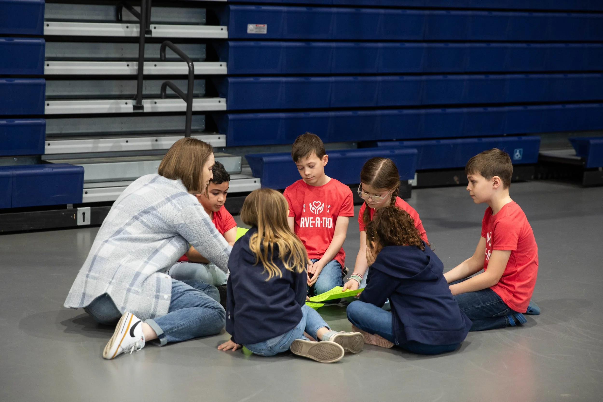 A group of children sitting on the floor in a circle with a woman, possibly a teacher or coach, overseeing an activity, in an indoor sports arena with blue bleachers in the background.