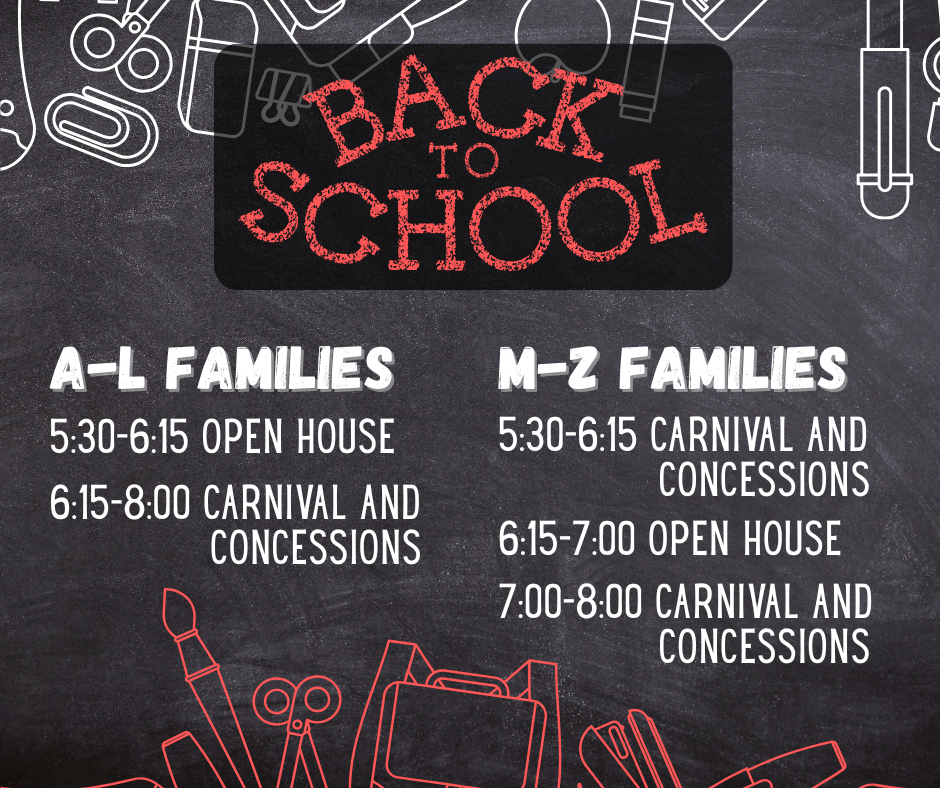 We are so excited to see ALL our students and their families next Thursday, August 21st at BACK TO SCHOOL NIGHT! The evening will have two events that you won't want to miss...our OPEN HOUSE and KICKOFF EVENT!
