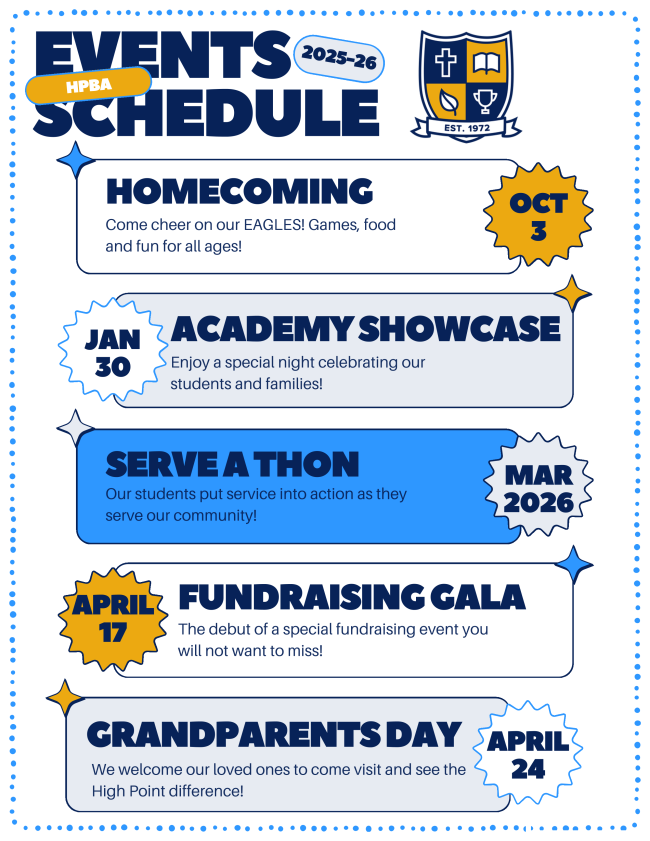 Save the Dates for some special events this school year! We are excited to come together for those that have been part of our High Point tradition for some time and are looking forward to some NEW events like our Fundraising Gala! We can't wait to share more with you in the next few weeks.